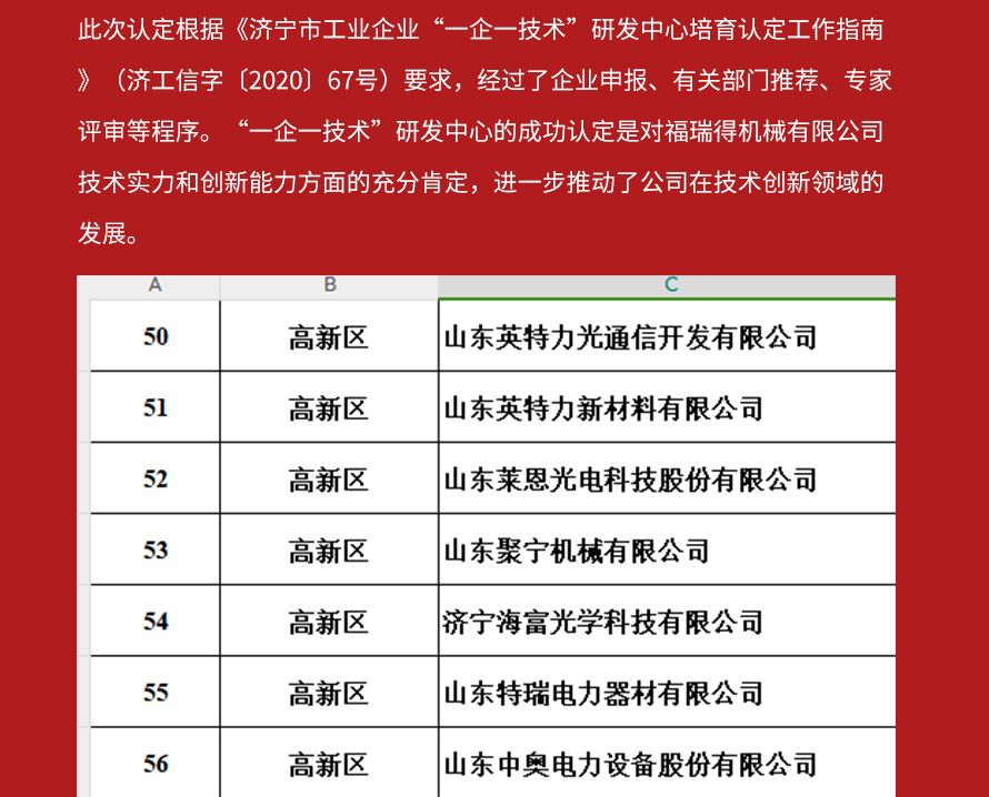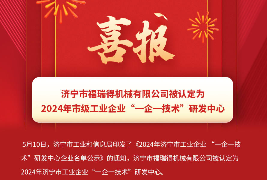 喜報(bào)!濟(jì)寧市福瑞得機(jī)械有限公司被認(rèn)定為市級(jí)工業(yè)企業(yè)“一企一技術(shù)”研發(fā)中心