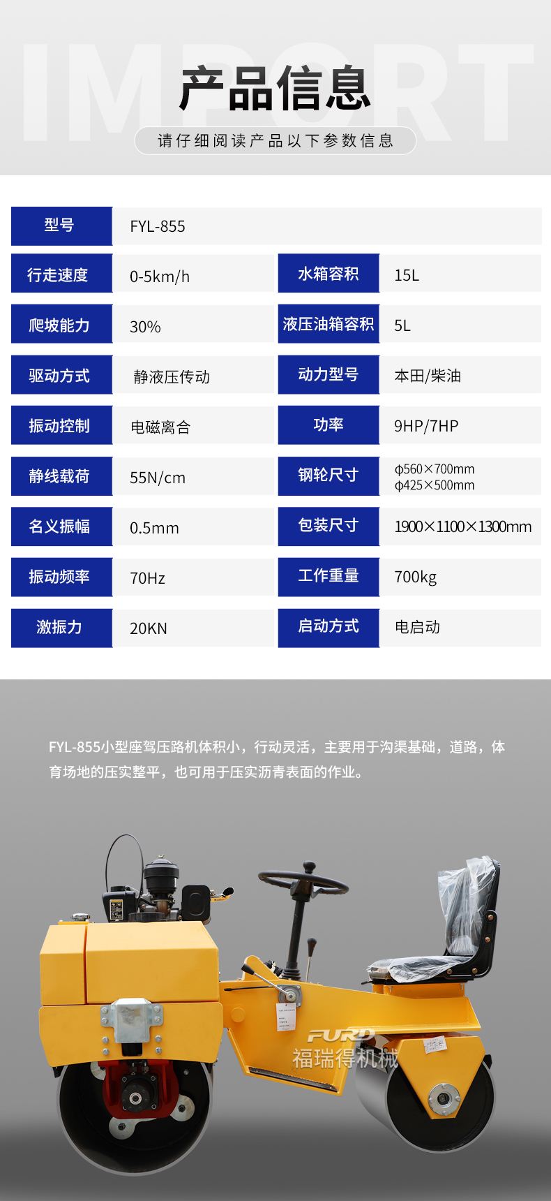 主要用于溝渠基礎,道路,體育場地的壓實整平,也可用于壓實瀝青表面的作業。