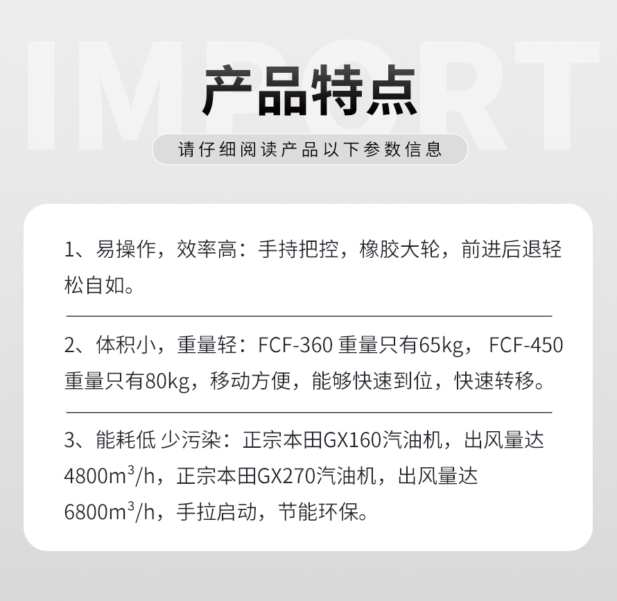 FCF-450路面吹風(fēng)機(jī)采用本田汽油動力,性能穩(wěn)定。風(fēng)葉動力平衡性強(qiáng),保證整體的穩(wěn)定性。大風(fēng)量,性能優(yōu)越。