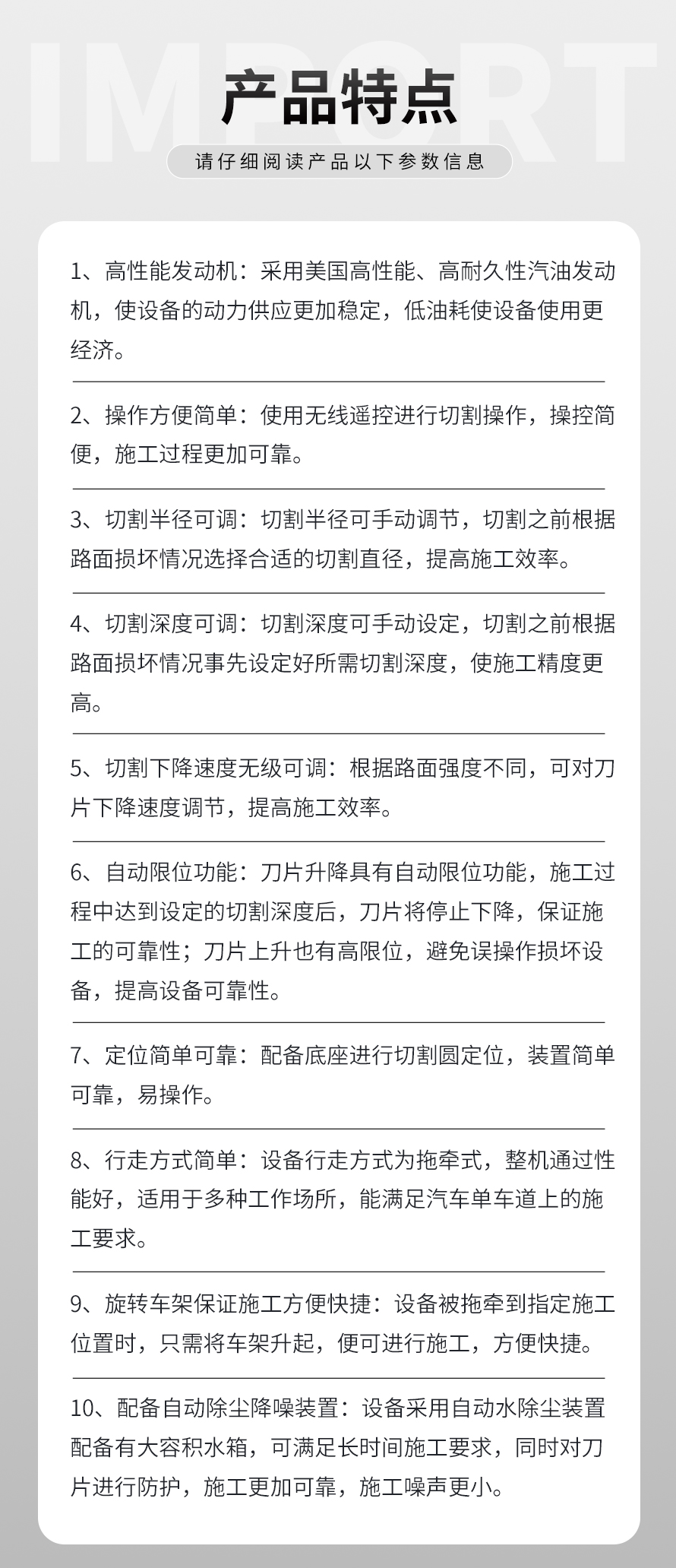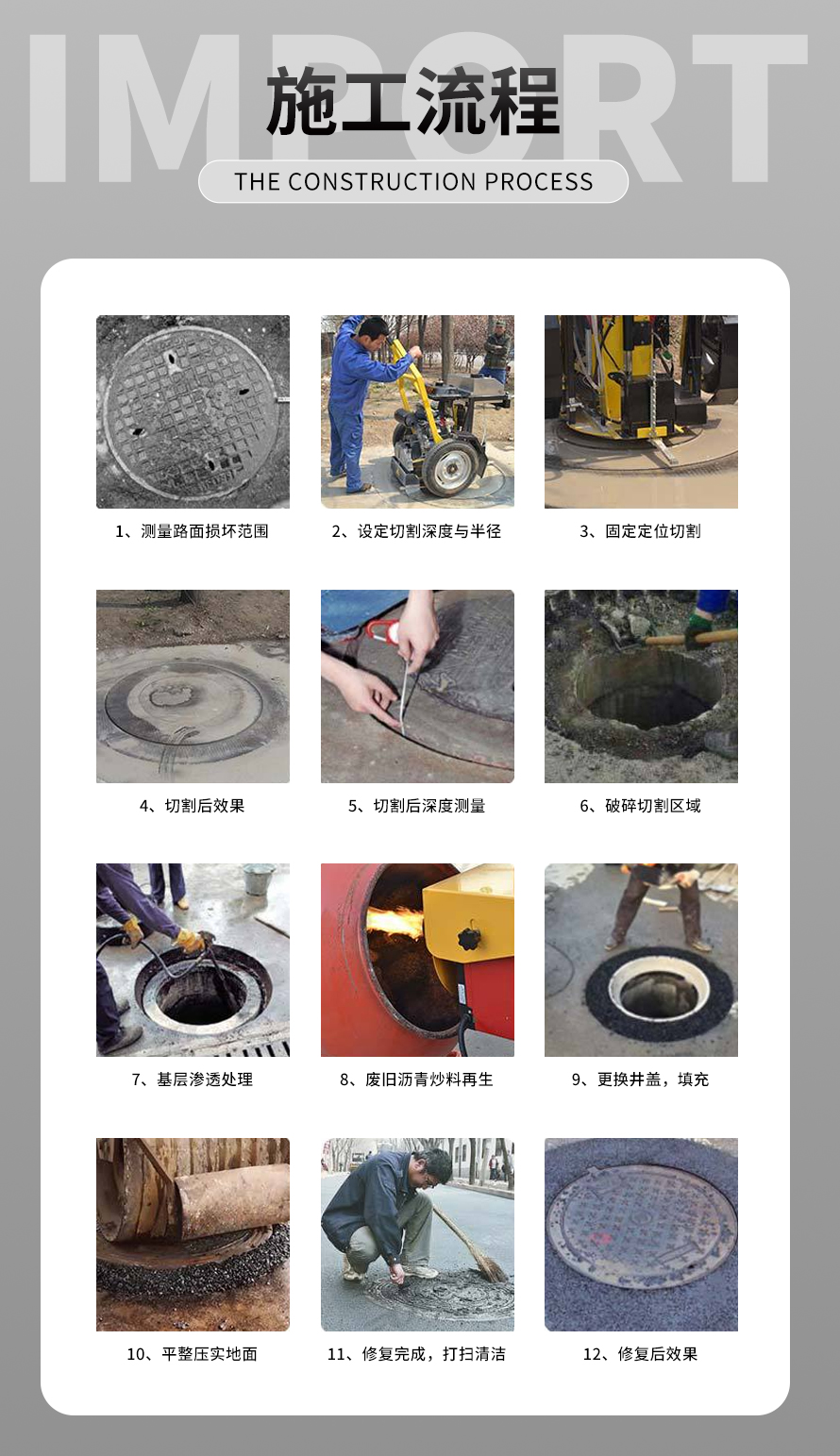 專(zhuān)門(mén)用于對(duì)城市道路中機(jī)動(dòng)車(chē)道等井蓋周?chē)乃嗷炷粱驗(yàn)r青路面進(jìn)行圓形切割。為清楚井蓋周?chē)钠茡p路面提供分割區(qū)域,修復(fù)后的地面美觀,延長(zhǎng)了路面的使用壽命。