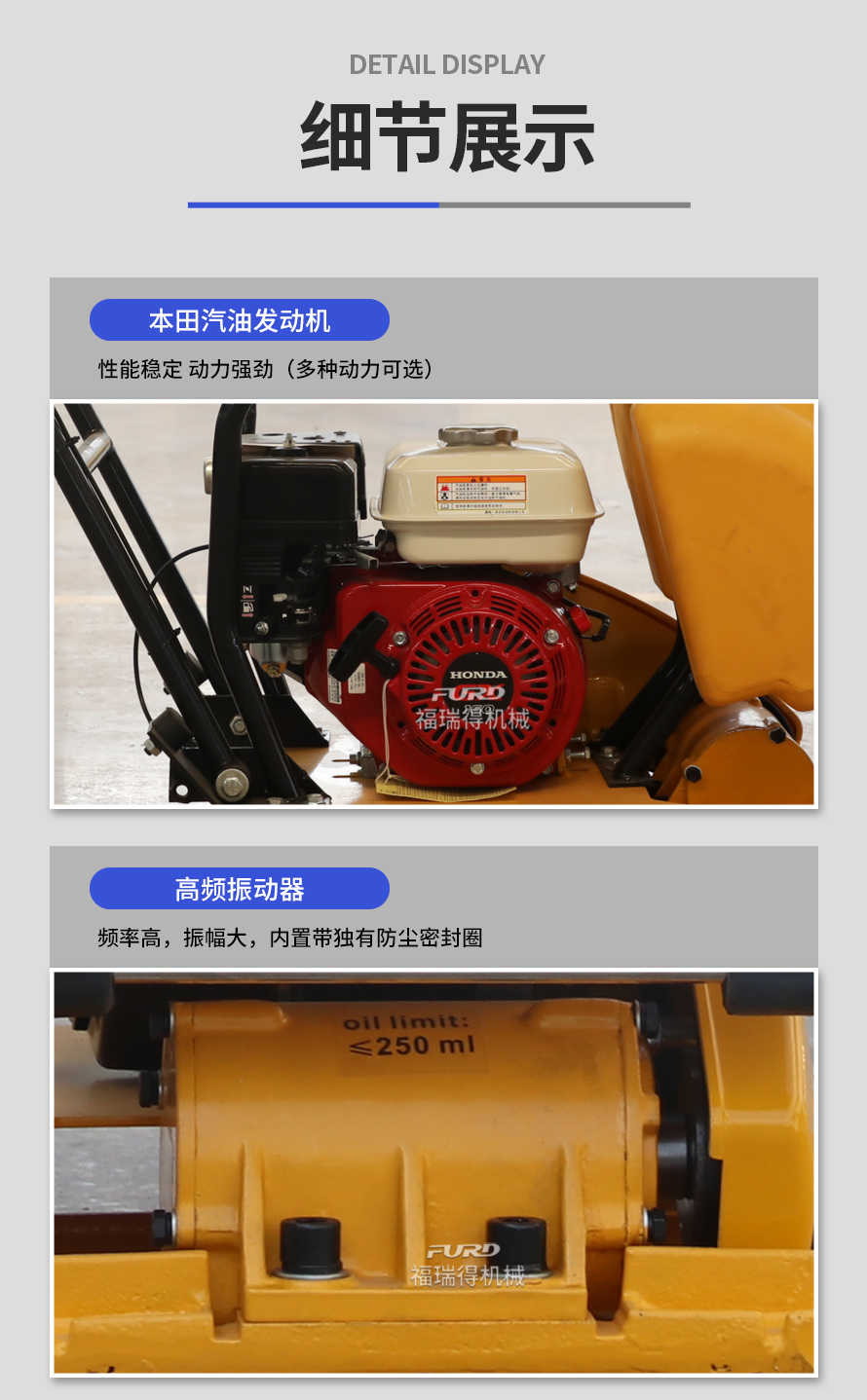 適用于路基邊緣、橋涵、管道、溝槽底部等狹長地帶的壓實。 本田汽油動力,名牌品質保證。