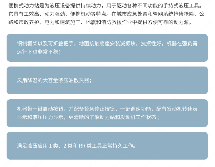 適用于路面搶修、道路施工、市政維護、保養(yǎng)、園林等工作場景 ;.設(shè)備安裝便捷,搬運簡便,適應(yīng)性強,可輕松解決破碎、切削、分裂、打樁、壓實等施工項目。